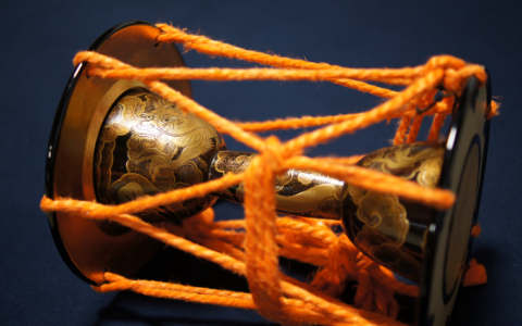 桜の木をくり抜いた砂時計型の「胴」を「馬皮」で挾み、麻紐でできた「調緒」で締めてあります。左手で持って右肩に担いで、右手で打ちます。左手で調緒を握ったり放したりして、音色を変えることができます。音色を変えることができる打楽器は世界的にも珍しいです。また温度や湿度にとても敏感です。